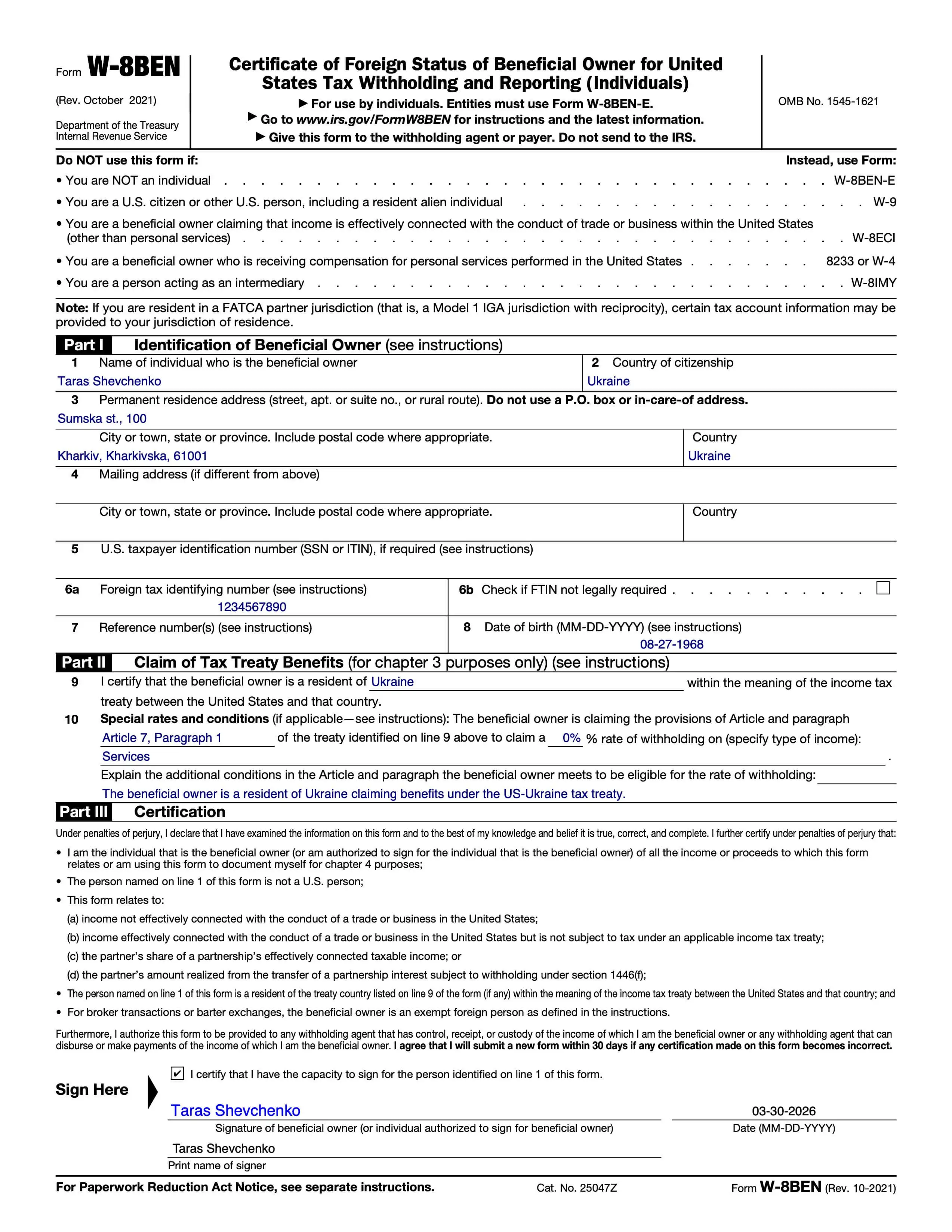 Google PlayやApp Storeで収入があり、米国外に居住している場合、W-8BENの提出が必要になることがあります。当ツールは、あなたの状況に合わせた記入済み・提出可能なフォーム作成を支援します。